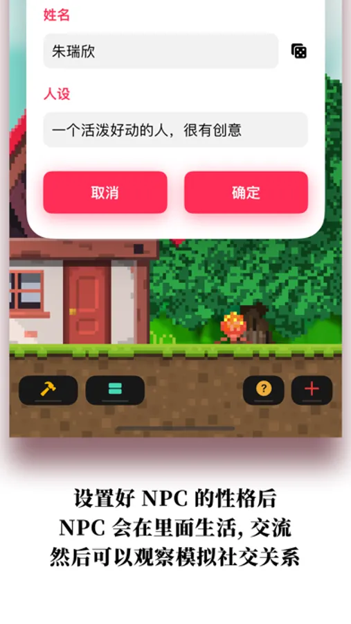 可以建造各种设施, 然后放入模拟角色, 设定角色的性格之后, 模拟角色将在这个世界里自主生活, 从而观察各种角色间的关系