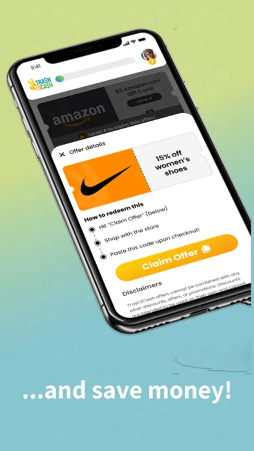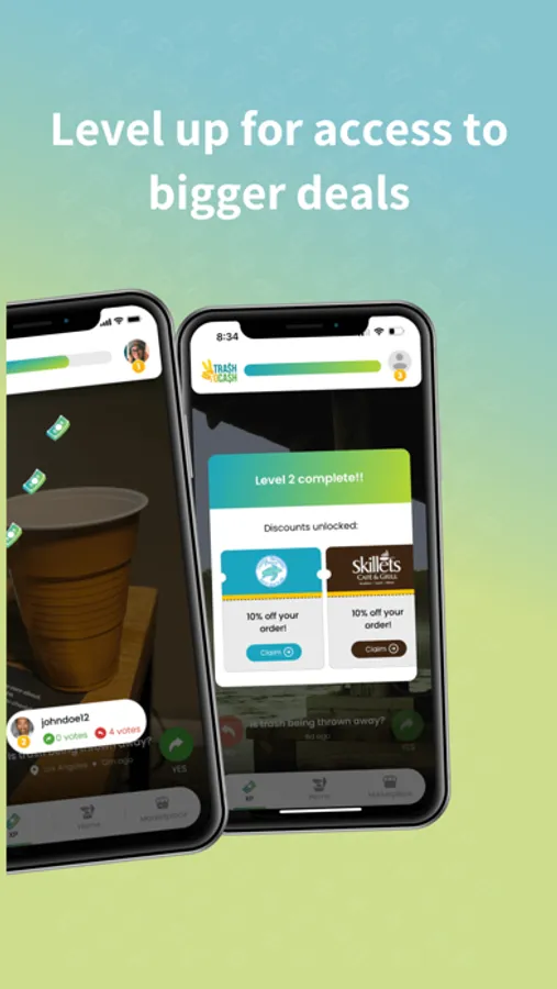 Trash2Cash saves you money and saves the world from litter! As you use the app, you'll "level up". The more you level up, the bigger discounts you'll earn. Level up by viewing others' photos and by taking your own photos. Claim the discounts you want and redeem them at businesses!