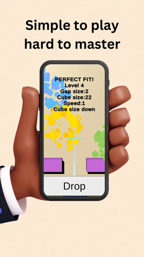 Experience the thrill as you aim for a gap of 20 or less, striving for that perfect fit. But be careful! If the gap is too big, or if you hit the paddles, it's game over. Perfect Fit keeps you on your toes and your eyes on the cube, making each successful drop a victory.