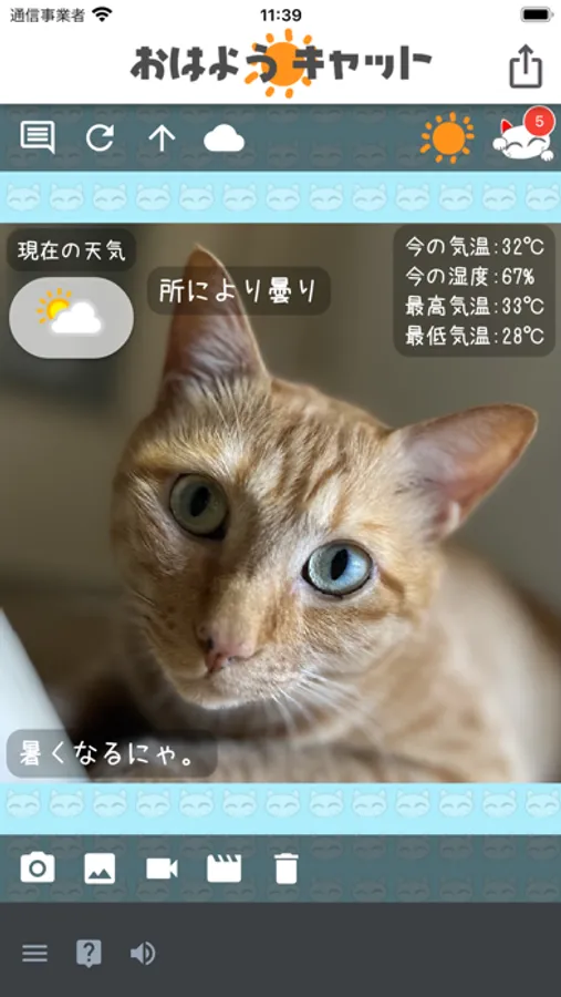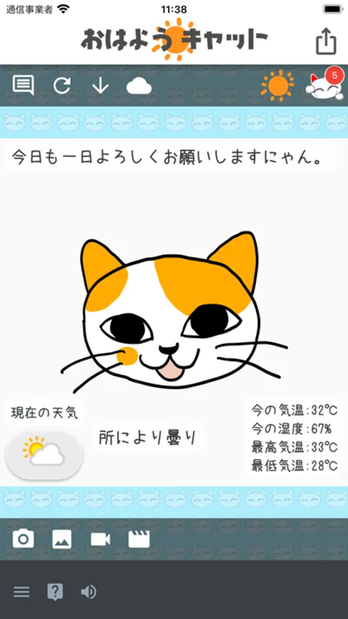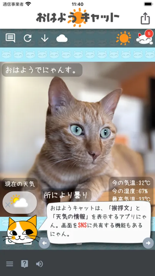 天気予報と挨拶文、ニャンコの絵を表示します。緩い感じで、ホッコリお天気を確認出来ます。