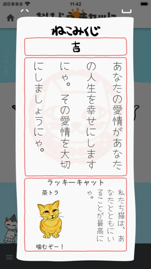 おまけ機能として、「当たるも八卦当たらぬも八卦」な、ねこみくじを引けます。1日の運勢を占ってみて下さい(あたらないですけど)。おみくじの文章部分をタップすると文章を読み上げます。