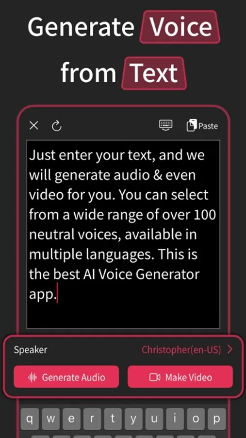 Instantly generate voice and video from text. Just input your text, the app will generate audio & video for you.