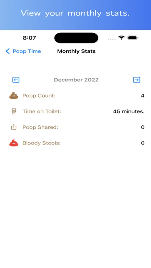 - Display Monthly Stats of your poop counts, the time you spent on the toilet, the number of poop entries shared, and bloody stools.