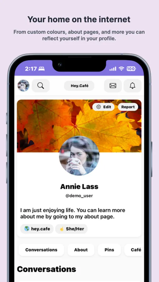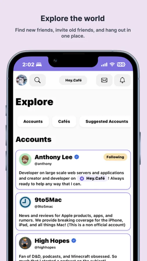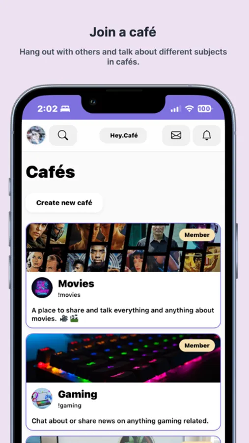Hey.Café is a new social network designed to be easy to use. When you join you can create new conversations and join communities that we call cafés based on your interests, and it's free to use.