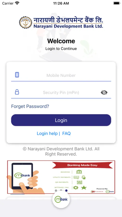 To be able to use this app, you first need to have a valid account maintained at Narayani Development mBank, and you need to subscribe to the Narayani Development mBank Banking Service.