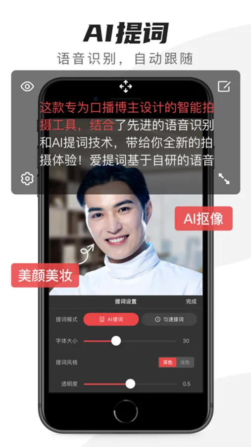 「爱提词」是一款备受各大平台up主青睐的vlog提词拍摄神器!在创作过程中,你是否曾遇到台词难背、布景难搭、表演乏味、剪辑困难等问题?别担心,「爱提词」提供了一系列强大功能,助你轻松解决这些困扰。AI提词拍摄、AI悬浮提词、虚拟背景和精准字幕等功能,让创作更加便捷。