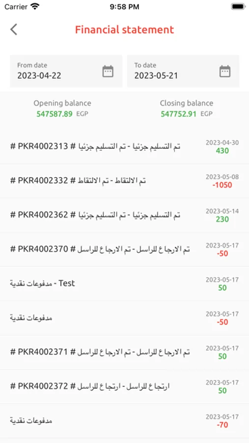 • كشف حساب العميل به تفاصيل المعاملات المالية