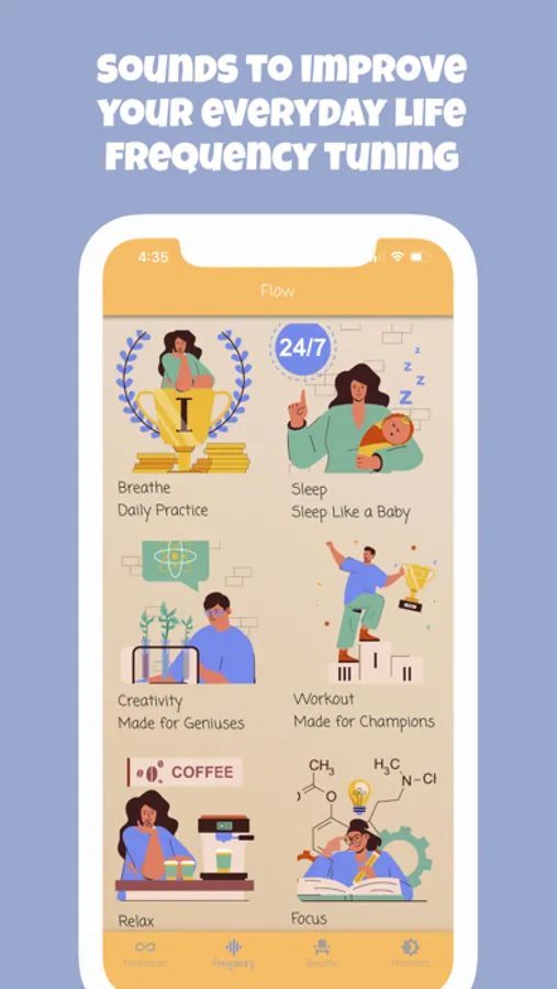 For frequency, this app provides a variety of music and sounds to help you breathe and improve your overall wellness. You can find daily workout and breathing exercises, music to help you sleep like a baby, sounds to help you tap into your inner creativity, and music to help you focus and relax. You can also enjoy chill vibes, zen music, and even animal healing sounds.