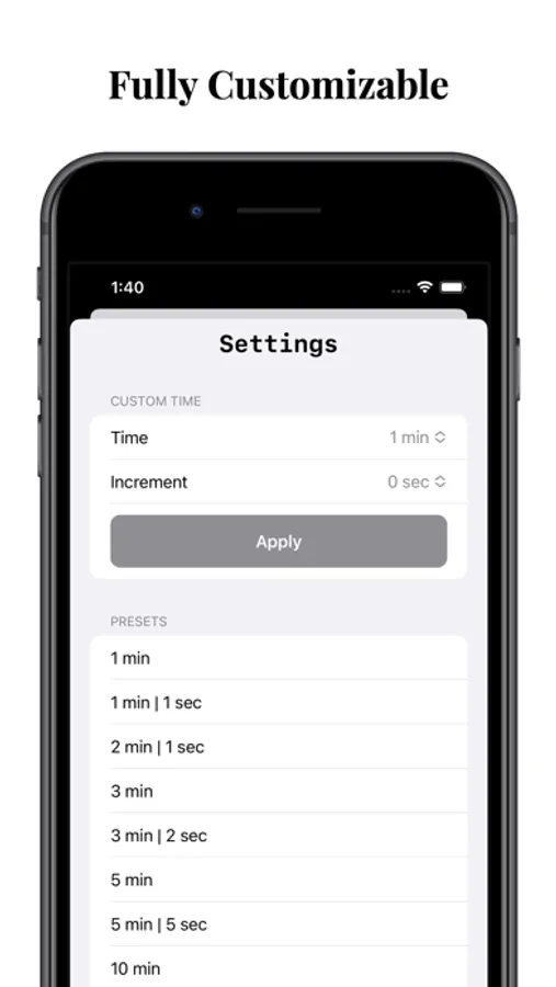 Fully Customizable: Choose from standard presets or customize the time controls to suit your game. You have full control over the duration of each game, time increments, and more.