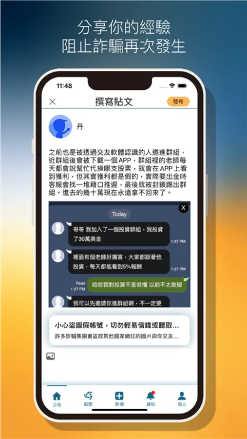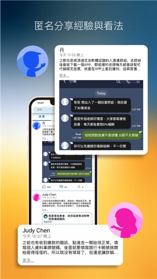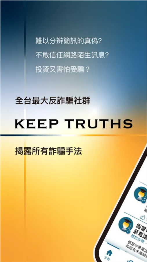 Keeptruths是最新的反詐騙社群,你可以匿名詢問詐騙問題或是分享你的看法及經驗,透過你的分享將阻止下一個人受騙。資訊透明與共享,讓身邊所有人都能有良好的管道知道最新的詐騙手法,還給所有用戶更安全的網路世界。