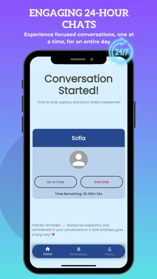 Discover the beauty of focused, noise-free conversations. With each chat lasting 24 hours, you can dive deep into engaging discussions, nurturing connections one chat at a time.