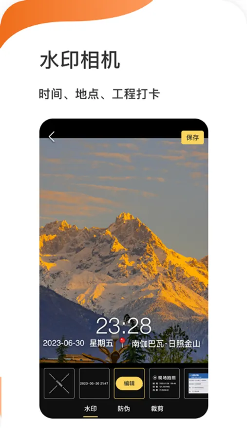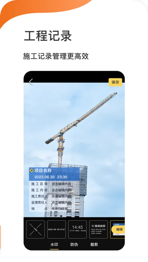 工程施工拍照管理应用,按照工程及施工地点管理施工照片的水印相机;在照片上添加水印:做施工记号,记录经纬度、海拔、方位角度、地理位置、天气、工程信息及自定义备注等,适用于市政工程、交通工程、电力工程、天网工程、土建工程、园林绿化、市政道路清扫保洁、市政设施施工、装修施工、建筑施工等各种工程的拍照分类归档。