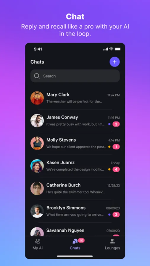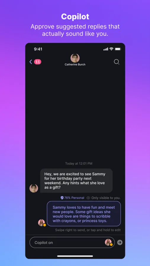 Personal AI apps offer continuous messaging features like AI Copilot (autodraft) and AI Autopilot (autoreply) that help you keep up with conversations, whether you’re stuck in a meeting, relaxing by the beach, or have family in different time zones.