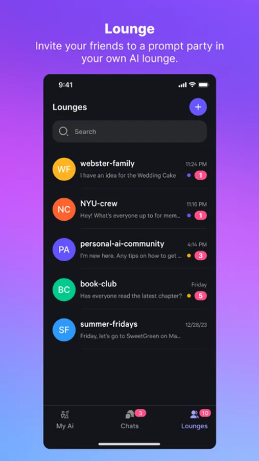 Chatting daily with others helps train your AI as you go. Create lounges and invite friends, family, neighbors, coworkers, and others to chat together using their personal AI.