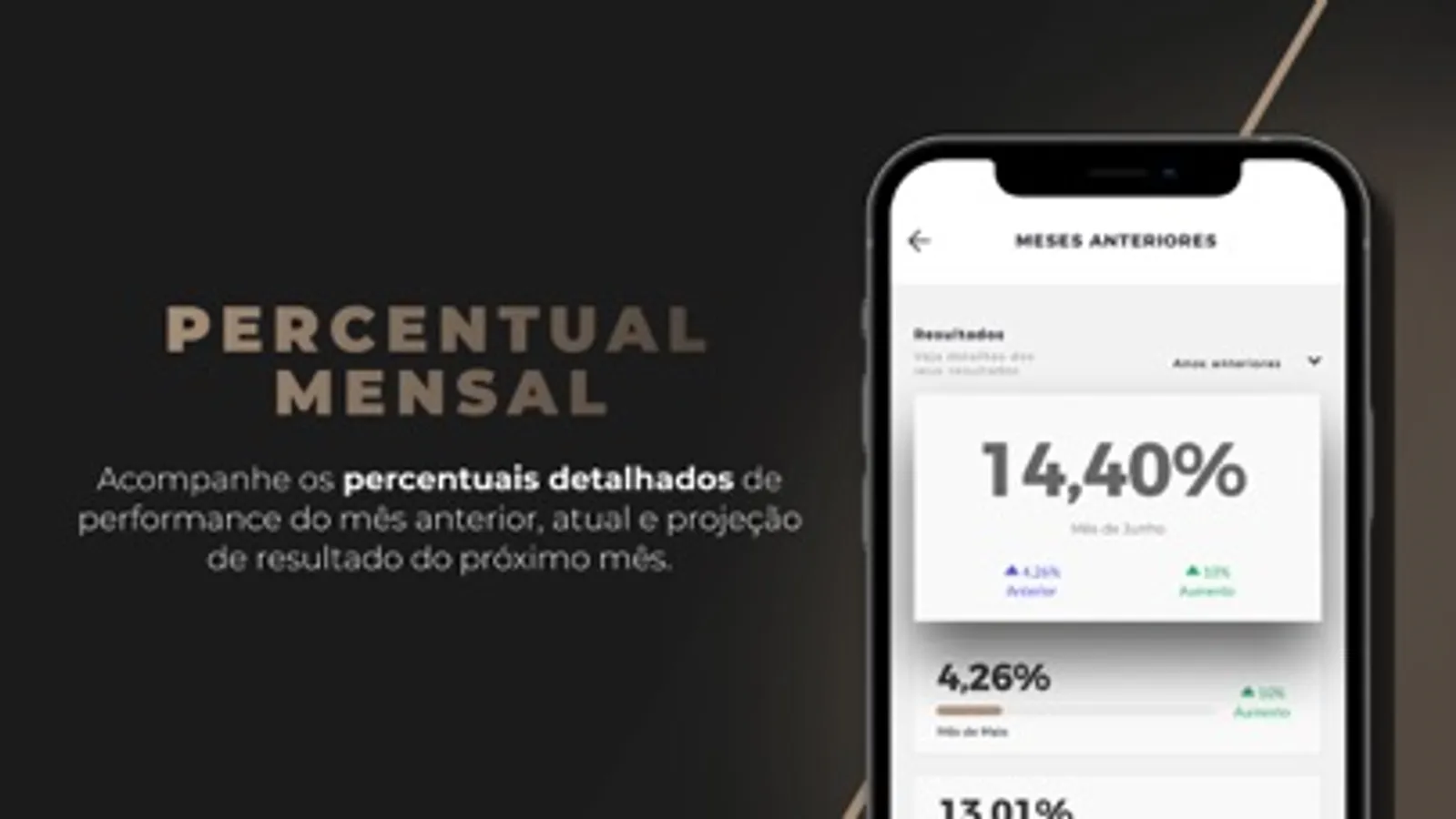 - Percentual Mensal: performance do mês anterior, atual e projeção de resultado do próximo mês.