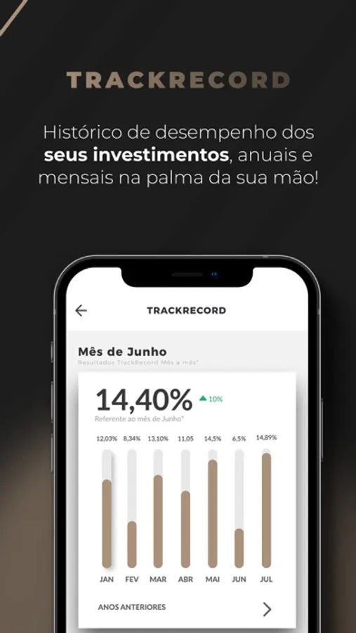 - Trackrecord: acesso ao histórico de desempenho dos seus investimentos, podendo filtrar relatórios mensais e anuais.