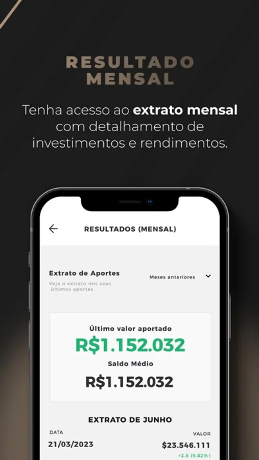- Resultado Mensal: Extrato mensal, com detalhamento de investimentos e rendimentos.