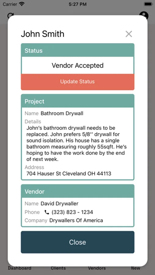 Both the agent and vendor can update the project status directly in the app, ensuring everyone remains in sync.