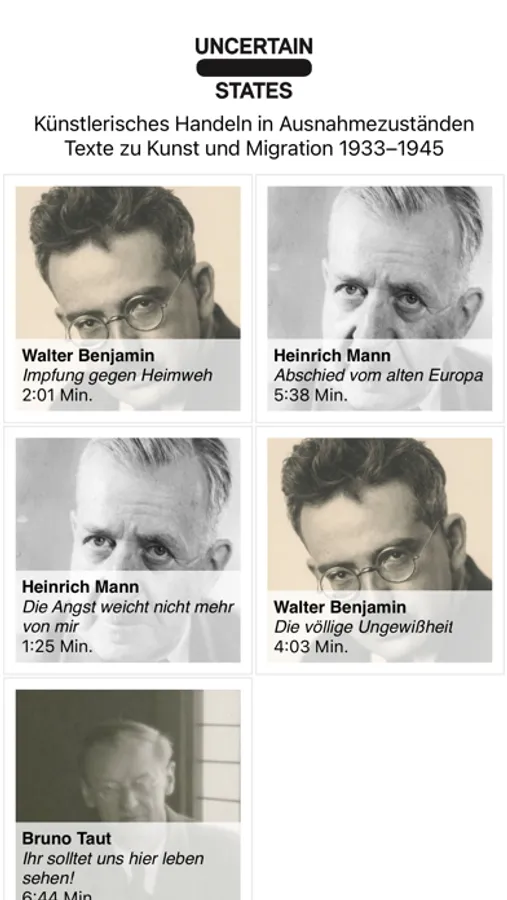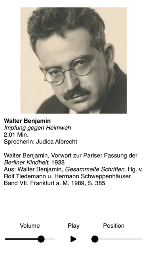 Mit dem AdK Player präsentiert das Archiv der Akademie eine Auswahl von O-Tönen, Dokumenten und Bewegtbildern aus seinen umfangreichen Archiven und Sammlungen. Ein Fokus liegt auf Dokumenten zu Kunst und Migration 1933–1945. Die App bietet weiterhin Zugang zu digitalen Angeboten, die im Rahmen von Ausstellungen und Werkpräsentationen des Archivs konzipiert wurden und wird sukzessive erweitert.