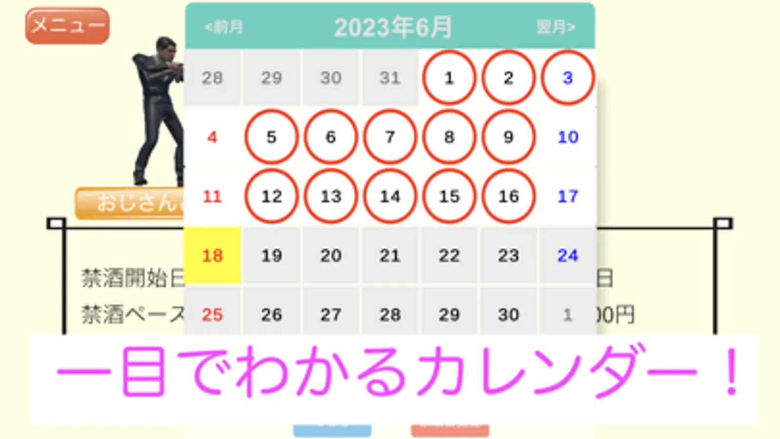Equipped with a calendar that allows you to see at a glance the date when you achieved sobriety. You can see your abstinence record at a glance. Abstinence data can also be modified from the calendar.