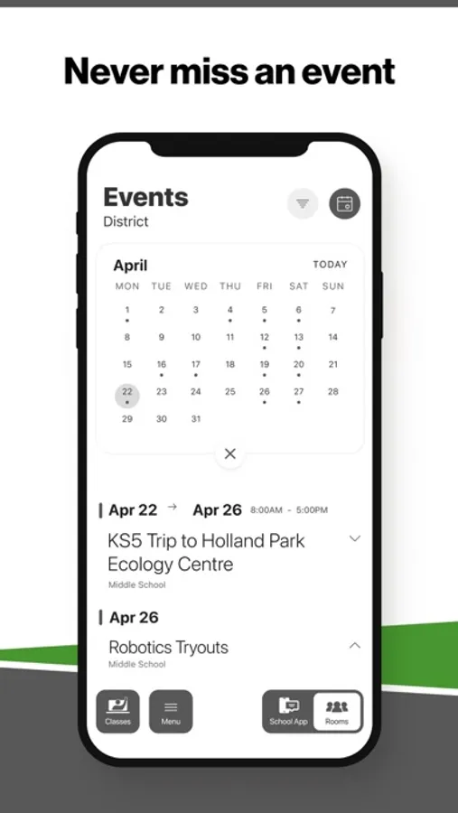 The event section shows a list of events throughout the district. Users can add an event to their calendar to share the event with friends and family with one tap.
