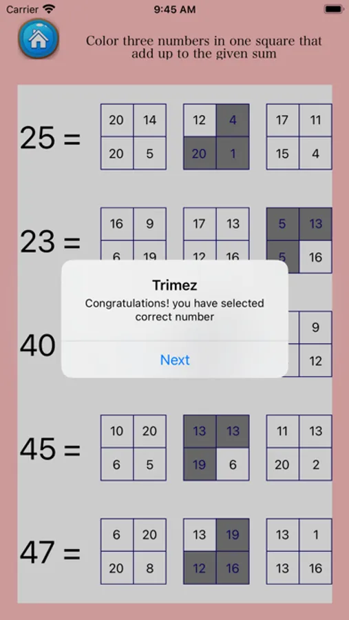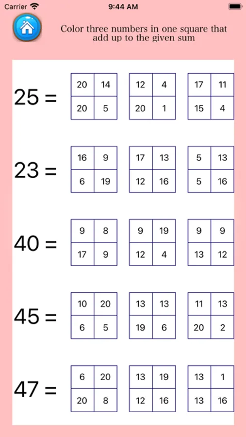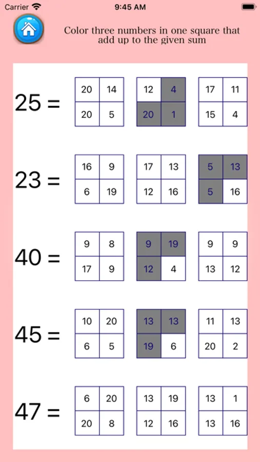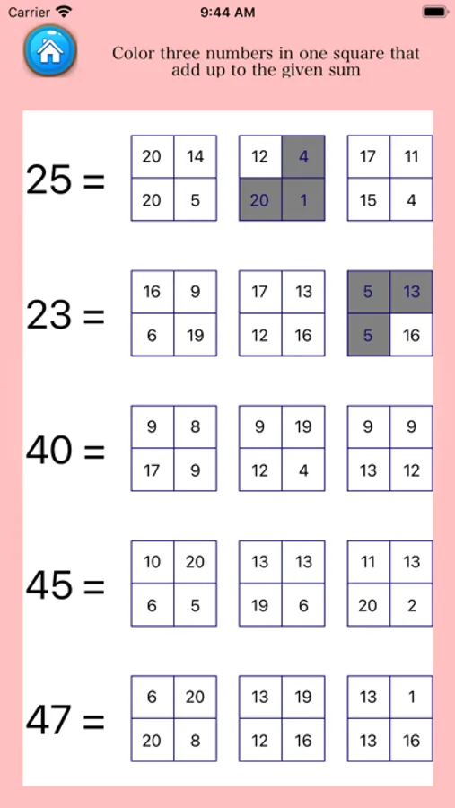 - In deze weergave een aantal en ook drie opties, kunt u drie getallen in één vierkant tellen en kiezen die optellen tot de gegeven som.