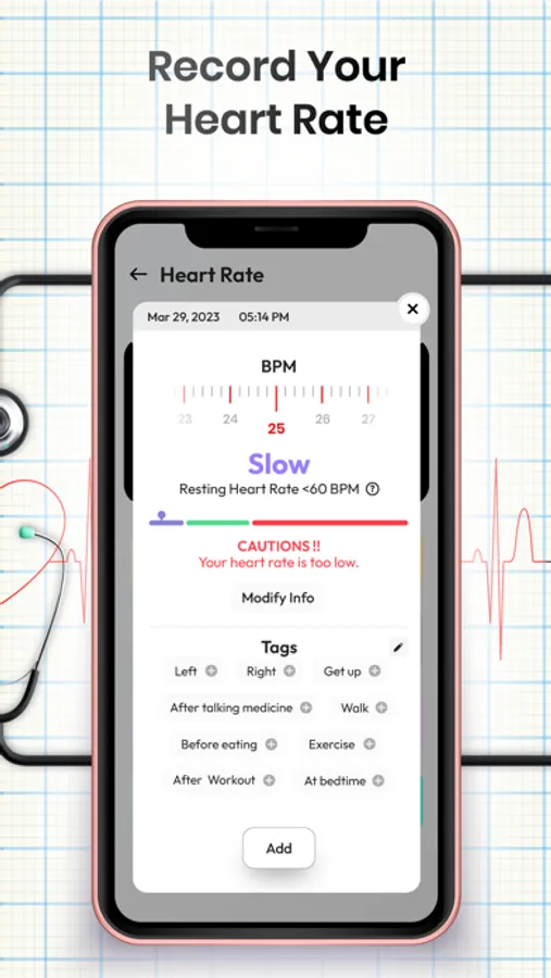 ⇒ Add Tags: Add customizable tags or labels to your readings in the heartbeat monitor app to organize it and make it easier to identify patterns or trends over time. Create, edit or delete and make suitable tags to quickly identify the triggers or situations that may be affecting your various measurements and adjust your lifestyle or medication accordingly.