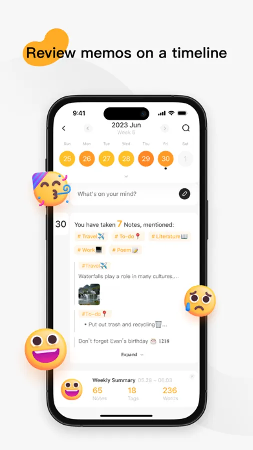 ・ Review your past memos through timelines and tags, and track your daily records with an intuitive heatmap.