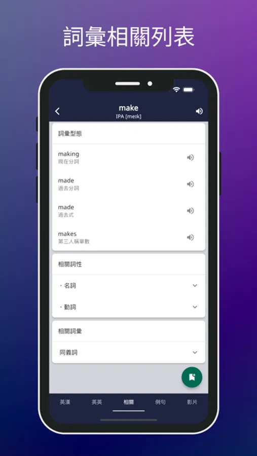 3. 詞彙型態列表:每個單字都會顯示其各種詞形變化,助您全面掌握單字。
