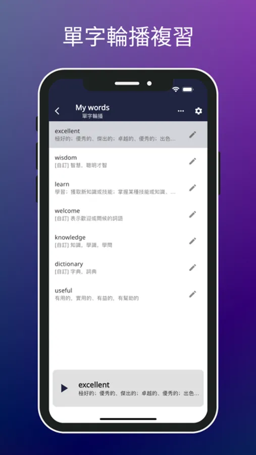 a. 單字輪播:以被動學習方式,App 自動輪流播放所有單字的語音,讓您不知不覺中記住單字。