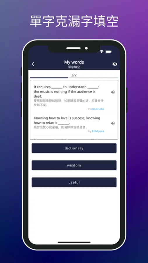 b. 單字選擇:透過聽音和釋義,選出正確的單字,提升您的聽力和詞彙理解。