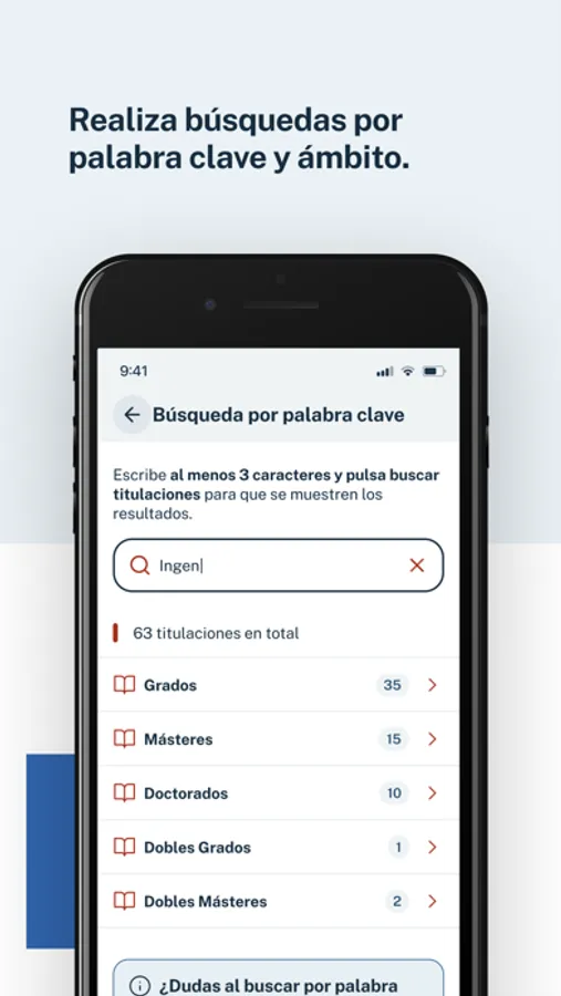 - Si tienes clara la titulación que quieres cursar, QEDU te aconseja la búsqueda por palabra clave. Para ello, te indica que escribas una palabra completa, tras la que podrás seleccionar el tipo de titulación que estás buscando y obtendrás unos resultados más precisos.