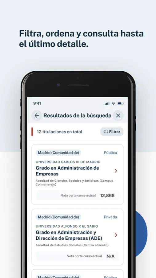 Tras tu búsqueda, QEDU te ofrecerá un listado de titulaciones que podrás filtrar por nota de corte, localización, universidad y tipo de estudios, entre otros. Cuando selecciones una titulación en concreto, podrás consultar todos los datos descritos anteriormente.