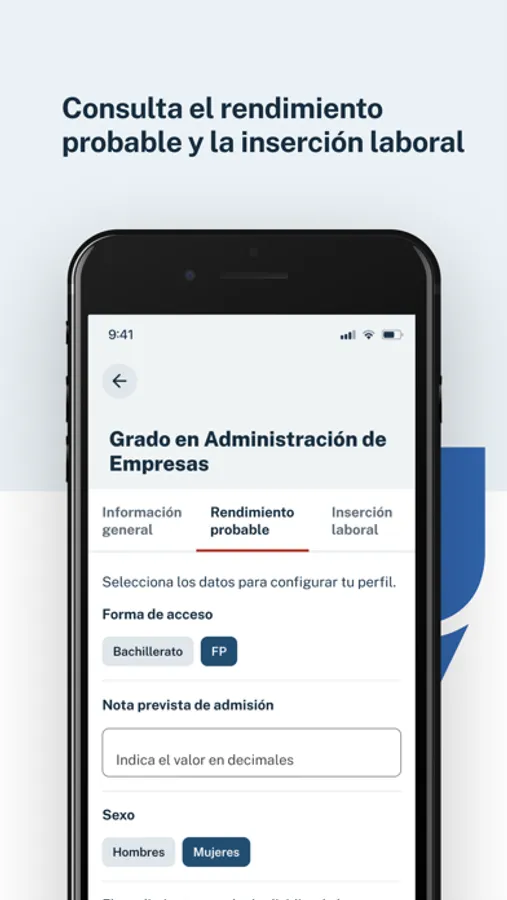 - En la pestaña del rendimiento probable puedes comparar el rendimiento del perfil del usuario en el ámbito de la titulación seleccionada con la media general de todo el ámbito.