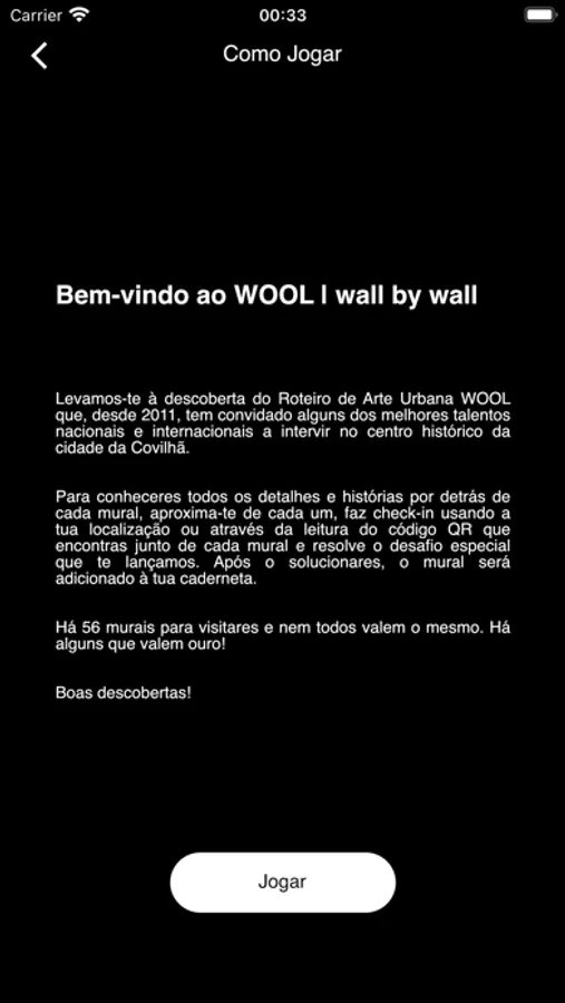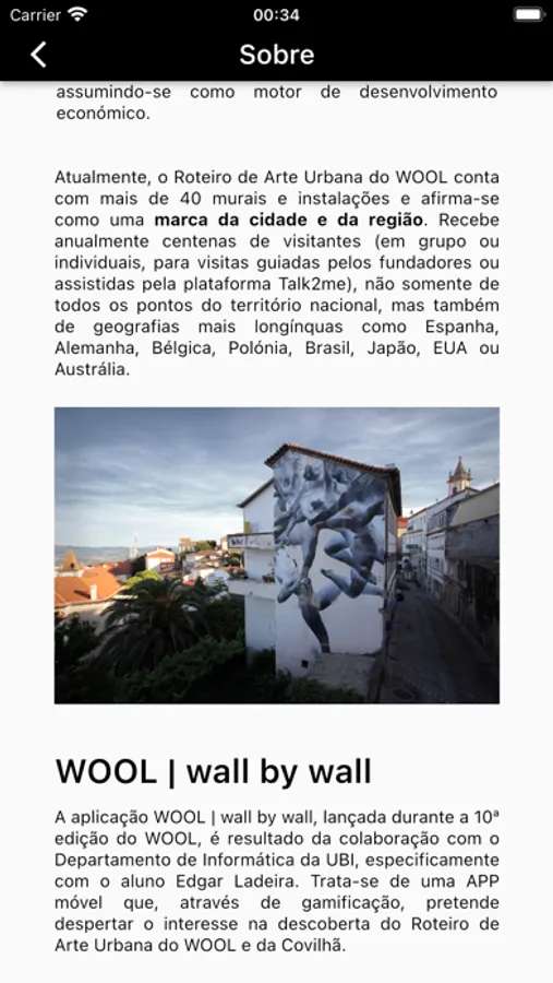 A aplicação WOOL | wall by wall, lançada durante a 10ª edição do WOOL, é resultado da colaboração com o Departamento de Informática da UBI, especificamente com o aluno Edgar Ladeira. Trata-se de uma APP móvel que, através de gamificação, pretende despertar o interesse na descoberta do Roteiro de Arte Urbana do WOOL e da Covilhã.