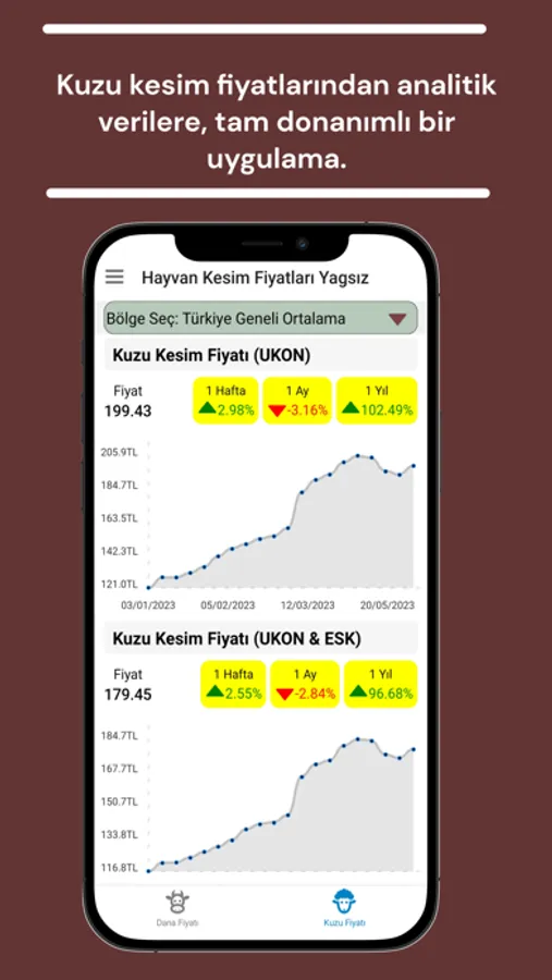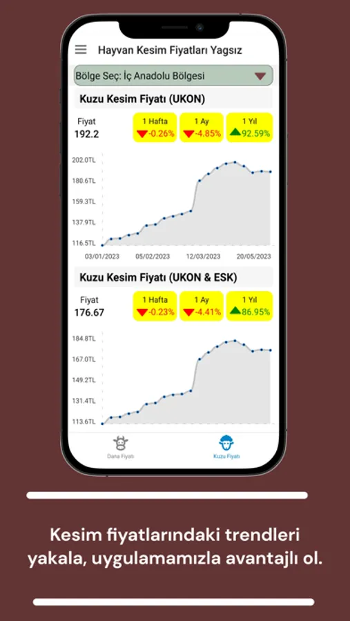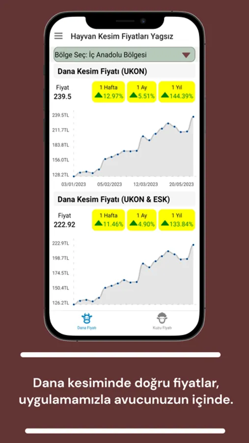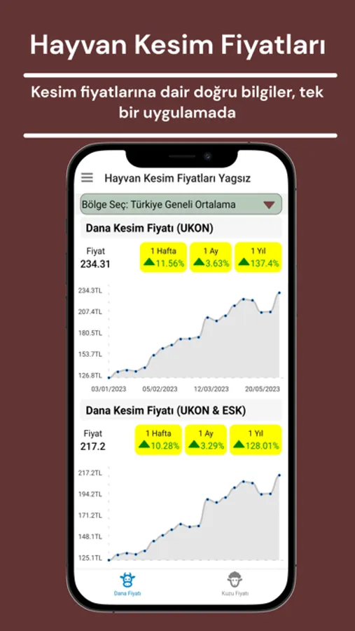 •Uygulamamız aynı zamanda 7 farklı bölge için dana kesim fiyatlarını da içermektedir. Böylece, her bölge için spesifik fiyat bilgilerine erişebilir ve karşılaştırma yapabilirsiniz. Aynı şekilde, 7 bölge için kuzu kesim fiyatlarına da uygulamamız üzerinden ulaşabilirsiniz. Böylece, farklı bölgeler arasındaki fiyat farklarını ve eğilimleri gözlemleyebilirsiniz.