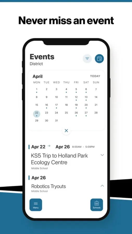 The event section shows a list of events throughout the district. Users can add an event to their calendar to share the event with friends and family with one tap.