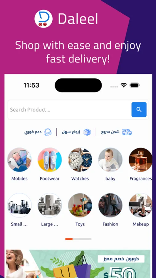 Our application features an easy-to-use interface and multiple search options. You can search for your favorite products and order them in a simple step. We also provide multiple and secure payment methods with fast shipping and tracking of your shipment until it reaches you.