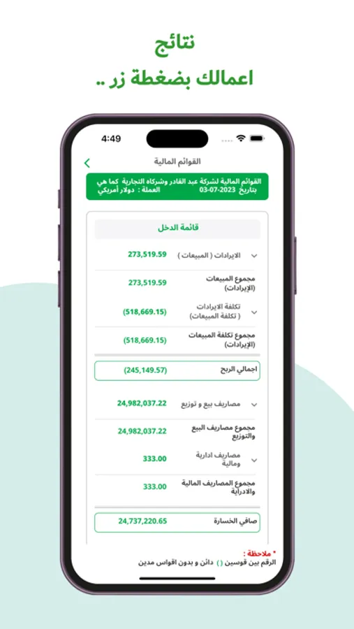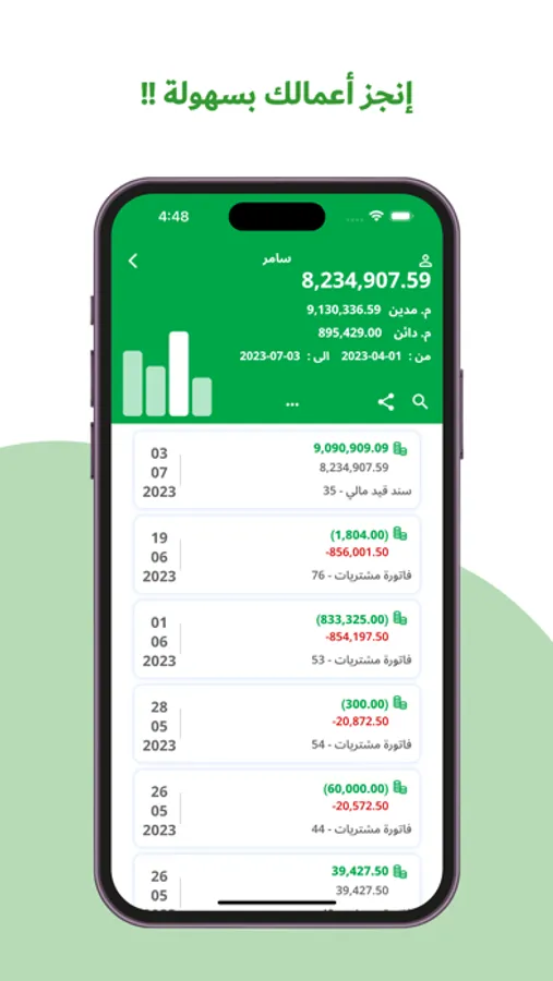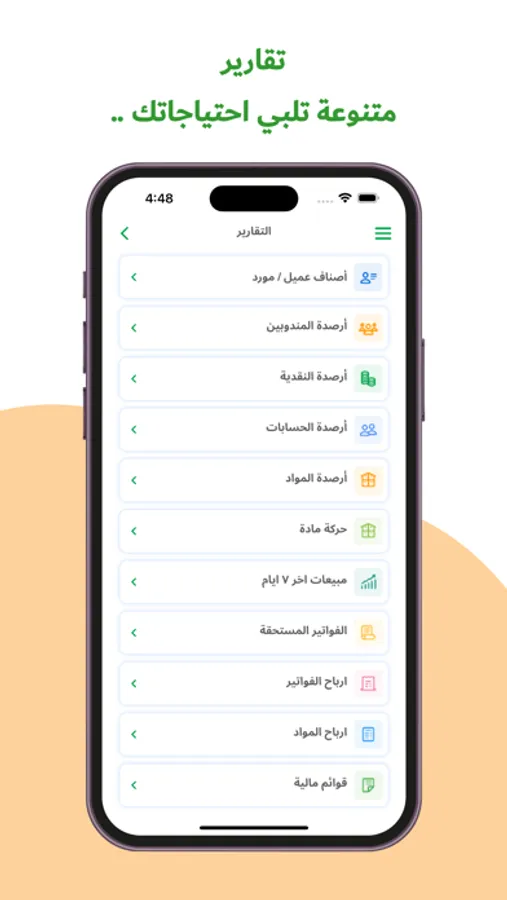 من خلاله يمكنك الحصول على تقارير عن اعمالك واستعراضها ومشاركتها ، واذا كنت تعمل مع محاسب عن بعد يمكنك ان ترسل العمليات والفواتير والدفعات عن طريق التطبيق للمحاسب وهو سيتولى عمليات التسجيل و الترحيل، وبسهولة يمكنك استعراض التقارير من نفس التطبيق مباشرة بعد اتمام عمليات الترحيل او أثناءها.