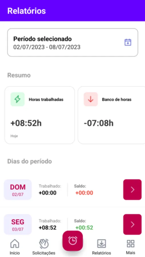 Acompanhe seu saldo de horas e horários de registro a qualquer momento, diretamente em seu celular.