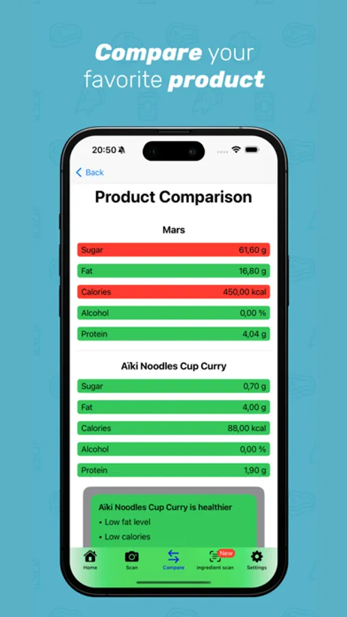 Detailed Food Analysis: Learn about energy content, proteins, sugars, fats, and more.