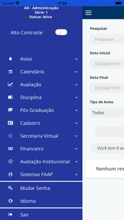 Acompanhe os horários de aulas, calendários de provas, notas, faltas, avisos, eventos, solicitações de serviços e informações financeiras, entre outros.