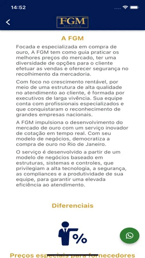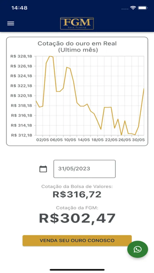 O aplicativo FGM foi desenvolvido para pessoas que buscam o valor atualizado do ouro diariamente. Com ele o usuário pode visualizar a cotação do ouro em tempo real, além de negociá-lo diretamente com a empresa FGM através do app.