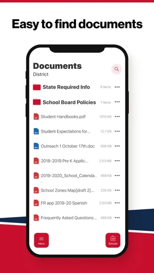 The event section shows a list of events throughout the district. Users can add an event to their calendar to share the event with friends and family with one tap.