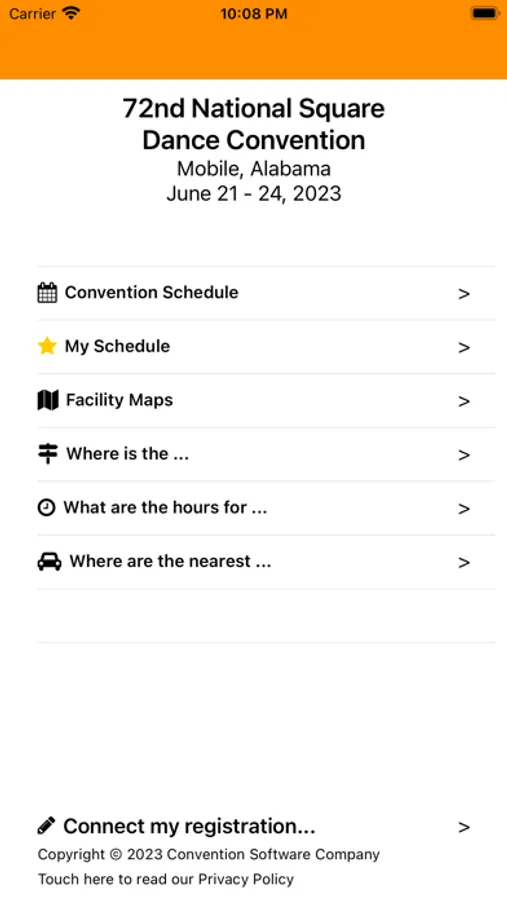 The app also includes facility maps, the hours various convention services will be available and guidance to nearby services in Mobile such as restaurants, gas stations, medical care, and so on.