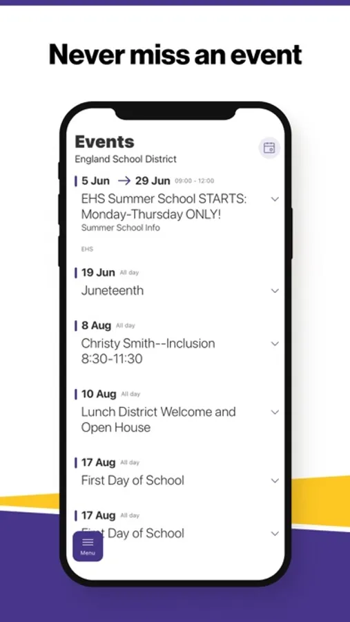 The event section shows a list of events throughout the district. Users can add an event to their calendar to share the event with friends and family with one tap.