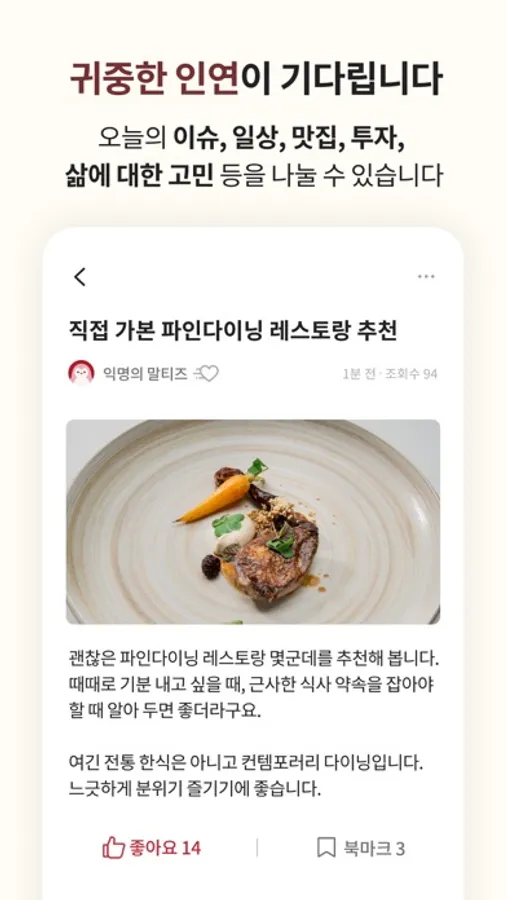 삶을 함께 하고 싶은 인연, 함께 성장할 수 있는 귀중한 인연을 만들고 인생을 어떻게 살아 갈지에 대한 고민을 나누며 삶의 방향을 찾아갈 수 있는 공간이 되었으면 합니다.