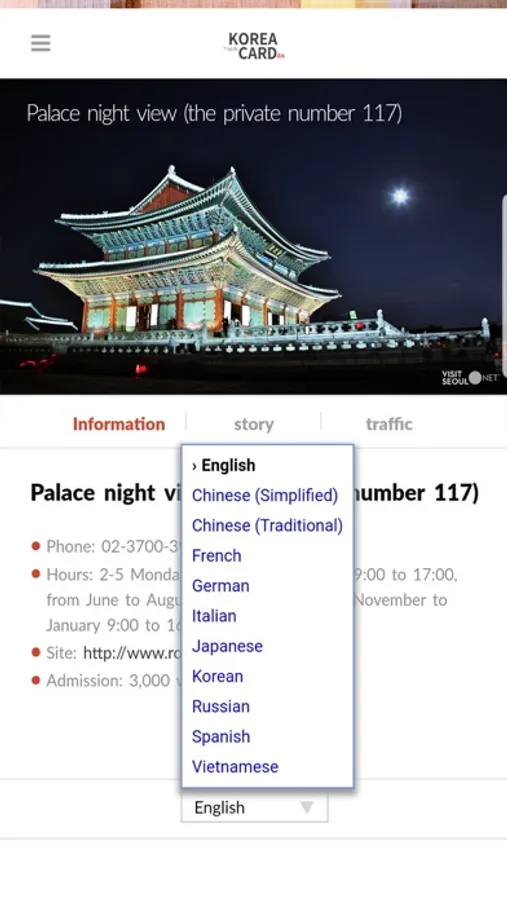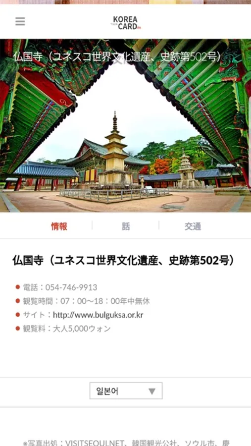 코리아카드(KOREA CARD)는 관광지의 상세정보(관광지의 사진, 전화번호, 사이트, 관람시간,