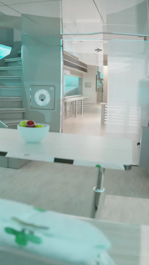 Thinking that something may have happened to the crew, the fisherman gets on board the yacht and explores the deserted interior of the vessel.