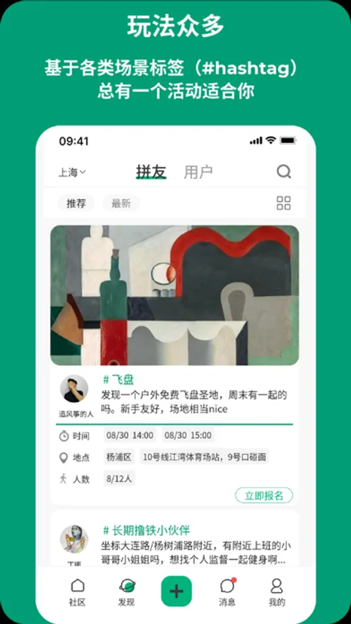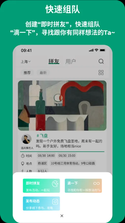 -即时拼友:基于各种场景标签搜索或主动发起活动,快速组队。